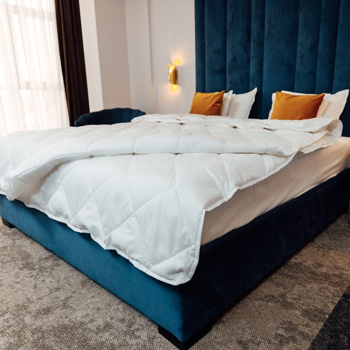 - Densitate: 550 g/mp – un echilibru perfect între confort, izolație termică și lejeritate. Asigură o temperatură constantă și comodă pe tot parcursul anului